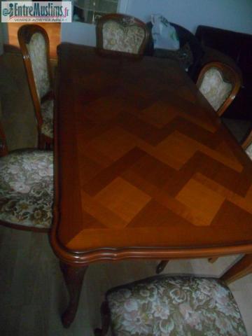 Assalam 'aleikoum, je vends une grande table en bois rustique avec 6 chaises en très bon état. La table possède une rallonge de chaque coté, possibilité de 10 places. Me contacter pour plus d'informations.