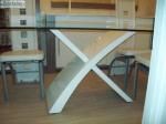Plateau verre trempé, épaisseur 12 mm. Pieds en panneaus de fibres de moyenne densité, finition laqué blanc.