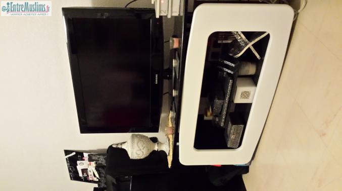 Vends meuble tv noir et blanc en bon état deux petits accrocs au niveau du revêtement plastique qui a un peu fondu à cause de bougies facilement camouflable.