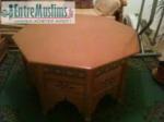 as salamu ahlaykoum je vend mon superbe salon marocain équiper de 2 bancs avec matelas en mousse de 2 accoudoirs et d'une magnifique table marocaine fabriquer a fés tout deux de meme motifs de couleur marron clair verni