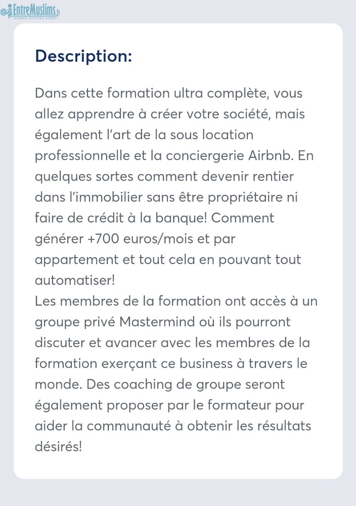 As salam aleykum wa rahmatulah wa barakatuhu je recherche des personnes intéressées pour intégrer une formation dans le but de devenir rentier immobilier sans ribat sans être propriétaire et avec peu d'investissement de départ. On vous explique étape par étape comment se lancer dans ce business, le formateur est joignable sur WhatsApp et répond à vos questions et vous avez aussi accès à un groupe privé via l'application Discord pour s'entraider et vous garantir la réussite dans votre business. C'est une opportunité pour les frères et les sœurs qui veulent devenir libre et indépendant financièrement. La formation en ligne est mise à jour souvent de manière à ce que l'on soit toujours informé des nouveautés, le paiement en 3 fois sans frais par carte bancaire est possible ainsi que le paiement via PayPal. Vous pouvez également financer la formation via votre compte CPF (tarif plus élevé dû aux charges administratives).