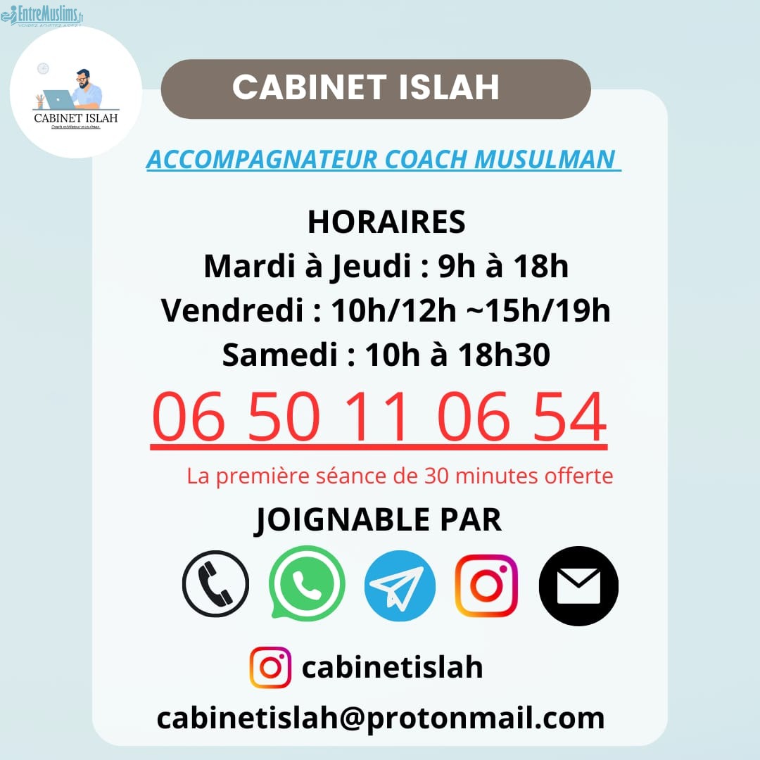 Salam alycoum, je vous présente le cabinetislah , je suis mohamed abou youmna accompagnateur-coach conjugal diplomé en coaching conjugal, spécialisé dans les problématiques de couples et les conflits de couples liée à différents problèmes( problème de communication, les enfants, la jalousie , divorce...etc) voyant le grand taux de divorce dans la oumma je propose des solutions et conseil pour régler les conflits conjugaux conseil religieux selon le coran et la sounna et conseil pratique cherchez le problème, écoute,analyse,accompagnement,solution.