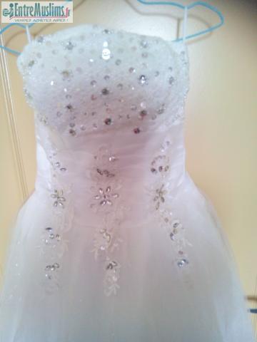 Magnifique robe de mariée bustier NEUVE Taille : 38/40 couleur : blanc Matière : satin et tulle Effet princesse Robe identique que sur la photo Fermeture à corset au dos + fermeture éclair Soutien gorge intégré sequins et strass en décor Robe totalement doublée en satin ARTICLE NEUF PORTÉE UNE FOIS Remise en main propre.