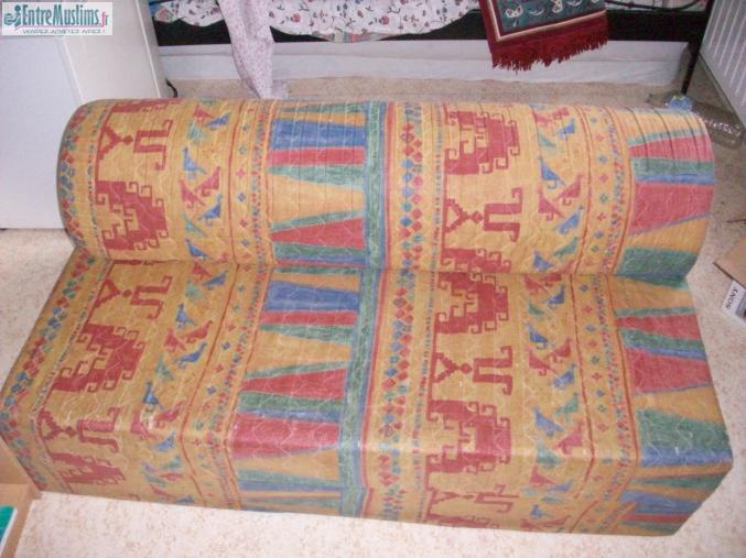 Chauffeuse orangée, en bon état malgré le tissu noir un peu déchiré de face et de dos mais ne se voit pas quand elle est fermé en canapé. Dimensions : 125x185 (ouvert), épaisseur du matelas 13cm