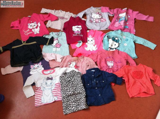 Vends vêtements filles pyjamas, ensemble, hauts, robes il y a du 12 mois , un peu de 3mois, 6 mois, 9 mois en bonne etat. Prix intéressants les hauts sont a 2euros, pyjamas 2 euros, ensemble 3euros. J ai aussi des chaussures, manteaux, vestes a petits prix. Les marques sont Disney, H&M, hello kitty, Absorba, kiabi...