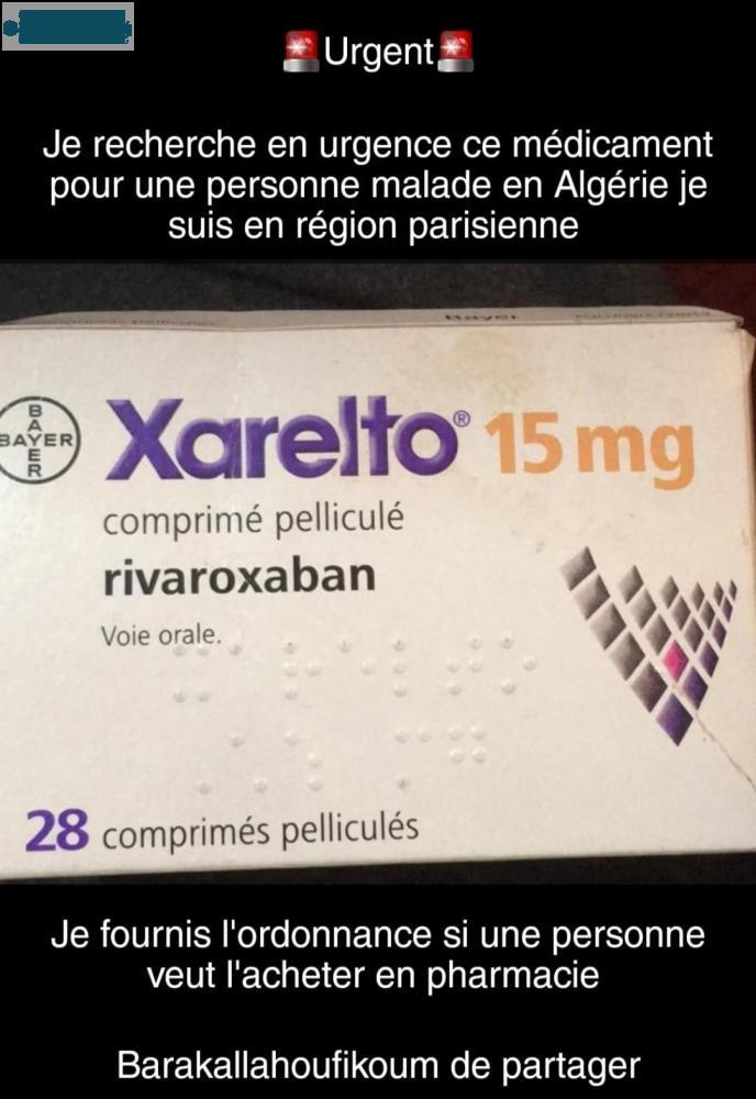 Une personne malade en Algérie à besoin d'urgence un médicament qui s'appelle XARELTO 15 Mg il y a l'ordonnance si une personne peut lui offrir une boite fissabililleh ça devient très urgent barakallahoufikoum je me déplace pour le récupérer