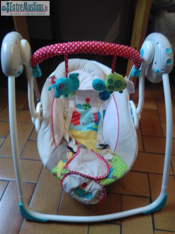 Je mets en vente une balancelle électronique toute neuf acheté pour la fille il y a 2 mois elle veut plus rentrer de dans. C'est une balancelle pliable et possibles il y a plusieurs mélodies et berce votr bbebe en fonction de son poids. Ça marche avec une pile. Je vents aussi une baignoire rose à € 10.