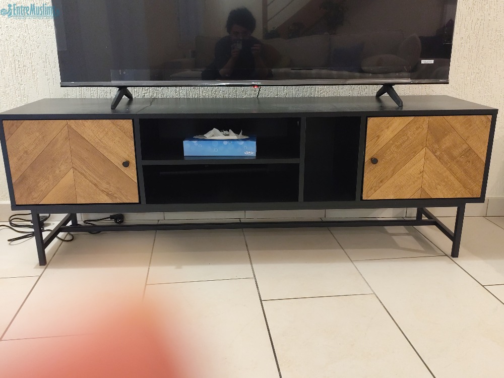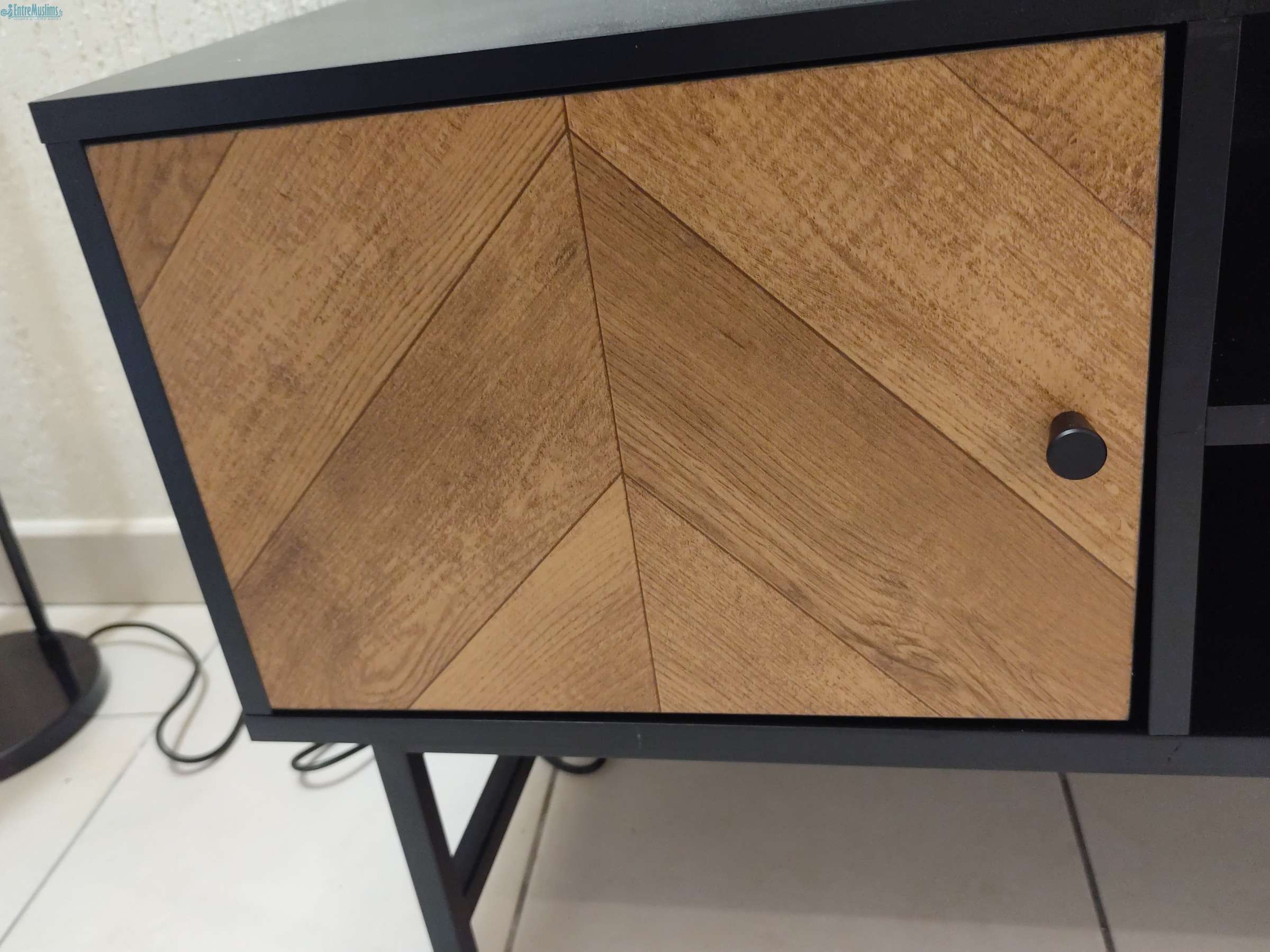 Je donne un meuble TV moderne en bois fissuré au dessus à venir récupérer. Nous avons essayé de réparer la fissure avec de la pâte à bois.