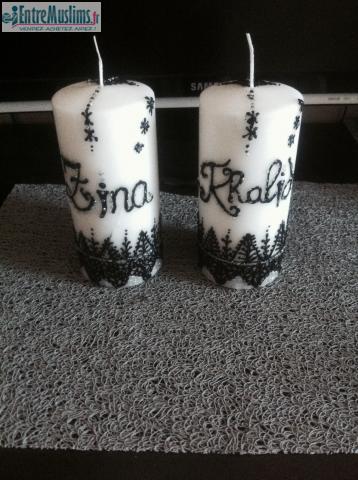 Salam alaykoum, je crée des bougies perso pour tout vos evenements MARIAGES FIANÇAILLES BAPTEME DECO DE MAISON ECT.. Les prix sont tres abordables et la qualité est assurée !