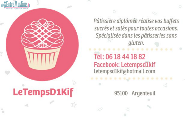 Letempsd1kif dispose d'une pâtissiere diplômée, qui réalise gâteaux, entremets, gâteaux orientaux, anglo-saxons, plats salés, etc... Tout pour satisfaire vos envies, qu'elles soit sucrées ou salées... N'hésitez pas à nous contacter pour un devis.