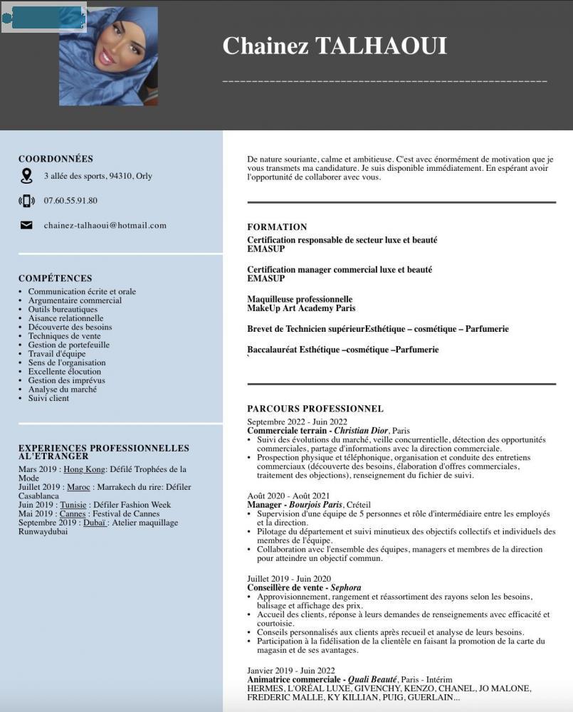 trouvé un travail en tant que commercial / responsable de secteur pour la maison Christian Dior. J'ai