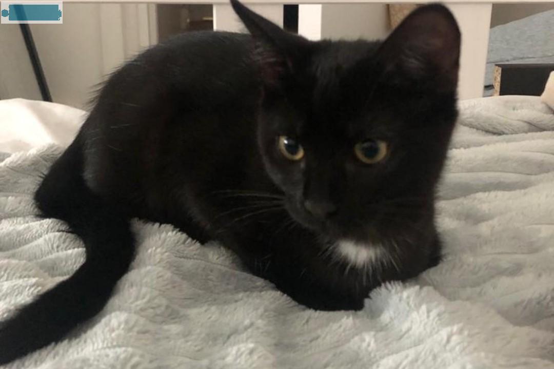 De couleur noir avec des parties blanches dont une sous la tête en forme de coeur blanc.