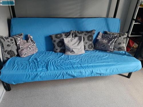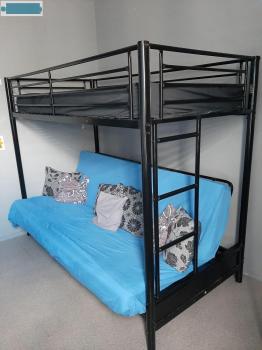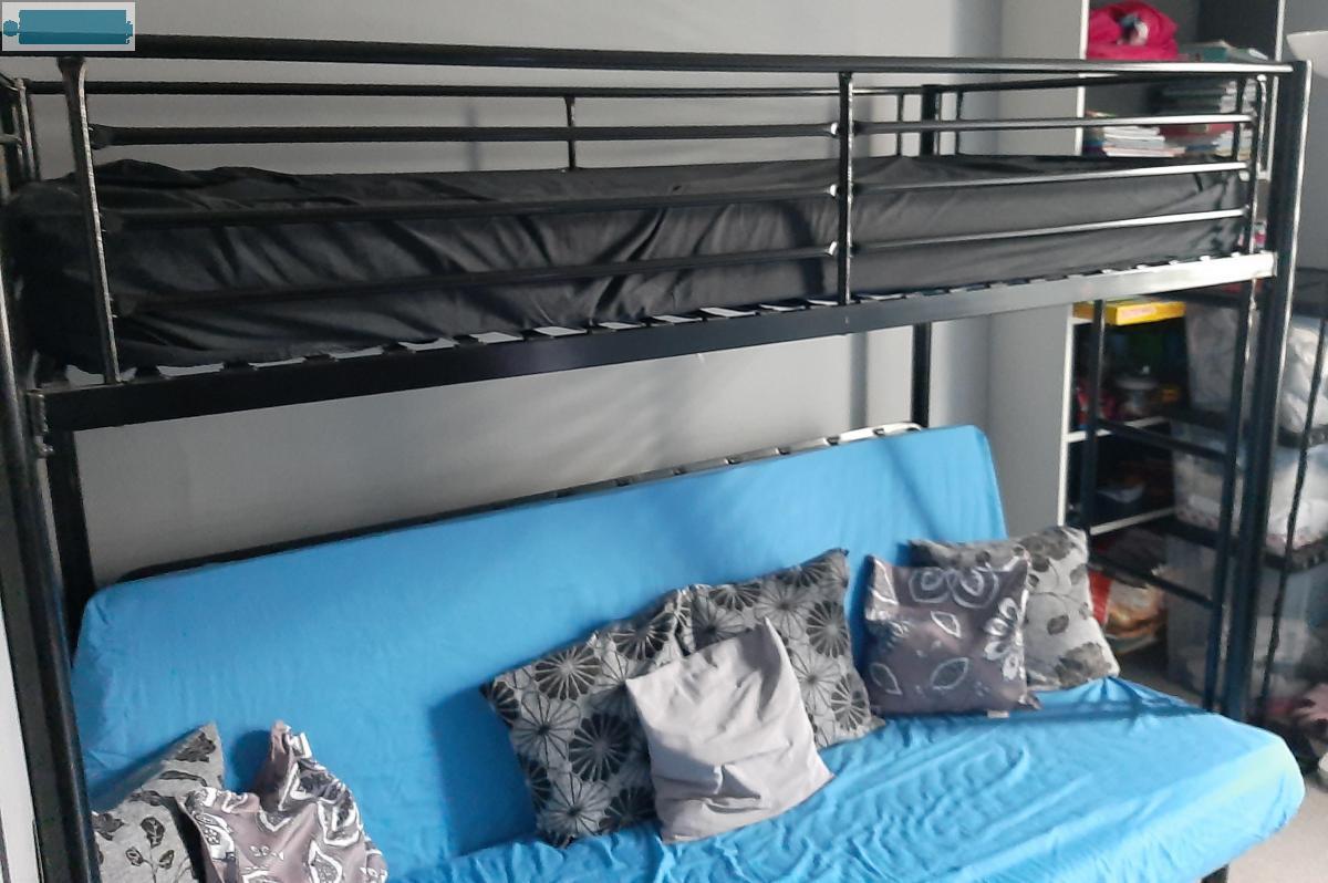 Lits superposés de couleur noir, lit d'en haut une place et lit d'en bas de deux places.