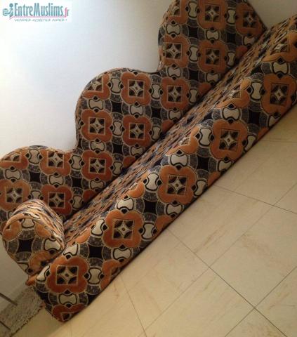 Je vends ce tissu pour salon marocain composé de 3 housses de matelas, 3 dos de cheameaux et 5 accoudoirs, de couleur orange bleu et blanc. L'ensemble est comme neuf.