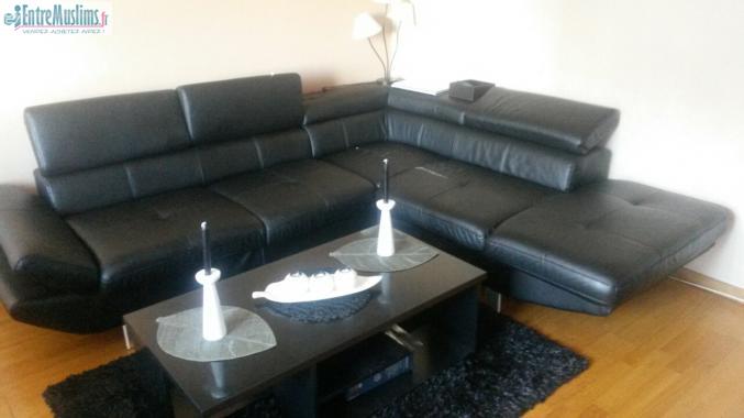 Salam alaykoum je vends mon canapé d'angle de couleur noir un peu abimé sur quelques coussins (voir photo).