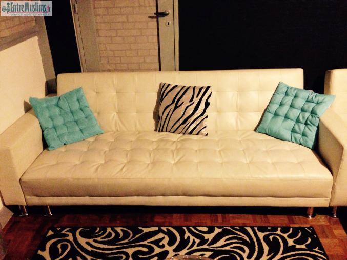 Salam alleykoum wa ramatullah wa barakatuh Vend canapé cuir blanc 3 places avec un canapé lit seul et une fois les deux parti assemblé fait un seul grand lit très bonne état je le vend pour financer ma hijra je les achète 1000€ je le vend 400€ l'ensemble à venir récupérer sur place