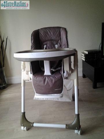 Vend chaise haute aubert couleur marron. Dossier inclinable, entierement déhoussable tout passe à la machine, chaise qui se règle en hauteur.