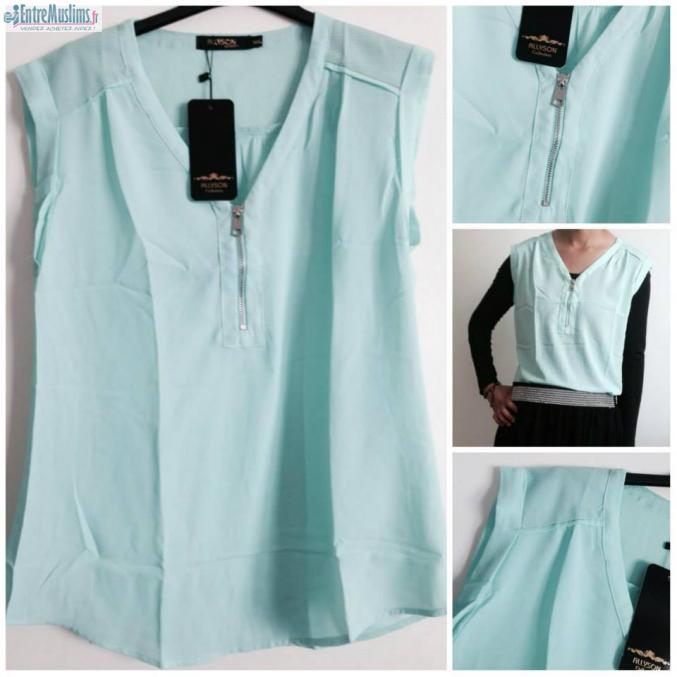 Je vends ces chemise bleu ciel sans manche avec petite fermeture éclair et petite déco au niveau des épaules.