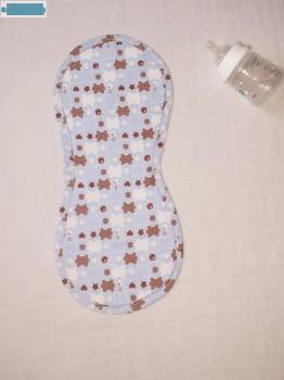 Le protège-épaule permet de protéger les vêtements contre les tâches de régurgitation, lorsqu'on fait faire le rot au bébé. Il est composé d'un tissu éponge, ainsi que d'un tissu coton très décoratif. Il a une forme en haricot pour s'adapter à l'épaule. Existe en deux coloris : fille et garçon.