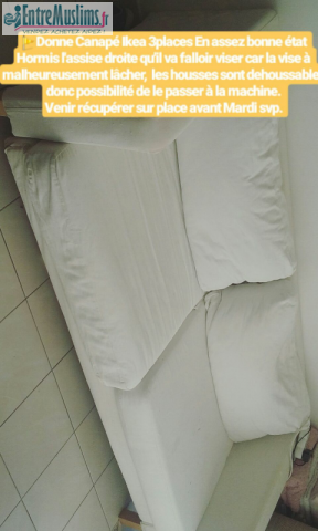 As salam 3alaykoum canapé ikea 3places à donner fissabillah, à venir récupérer rapider sur Mantes ma ville. Si jamais la photo ne s'affiche pas me contacter par E-mail pour que je puisse vous l'envoyer.