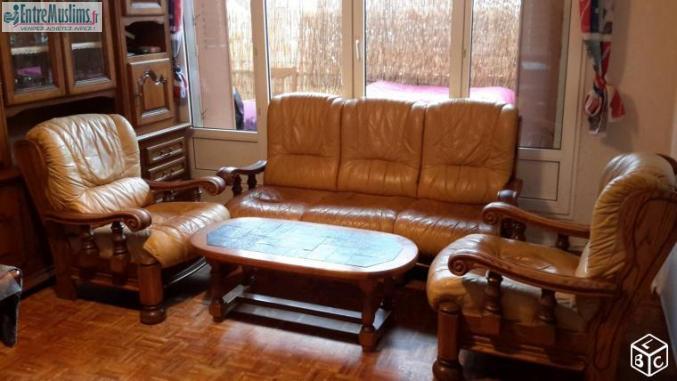 Je vends un ensemble de salon composé de 2 fauteuils et un canapé en cuir ( le tout en bois chêne massif ) et une table basse en chêne massif aussi. J'offre l'objet ( qui est devant la table basse ) qui sert à mettre publicités , journaux ... Mon numéro : 0768261309