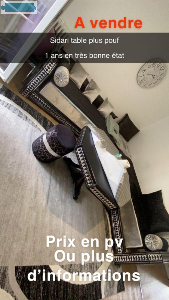 Salam Aleykum je vend un sidari avec sa table et son pouf en très bonne état acheter il y’a un ans si vous souhaitez plus d’informations merci de me contacter Barakallah u fikom