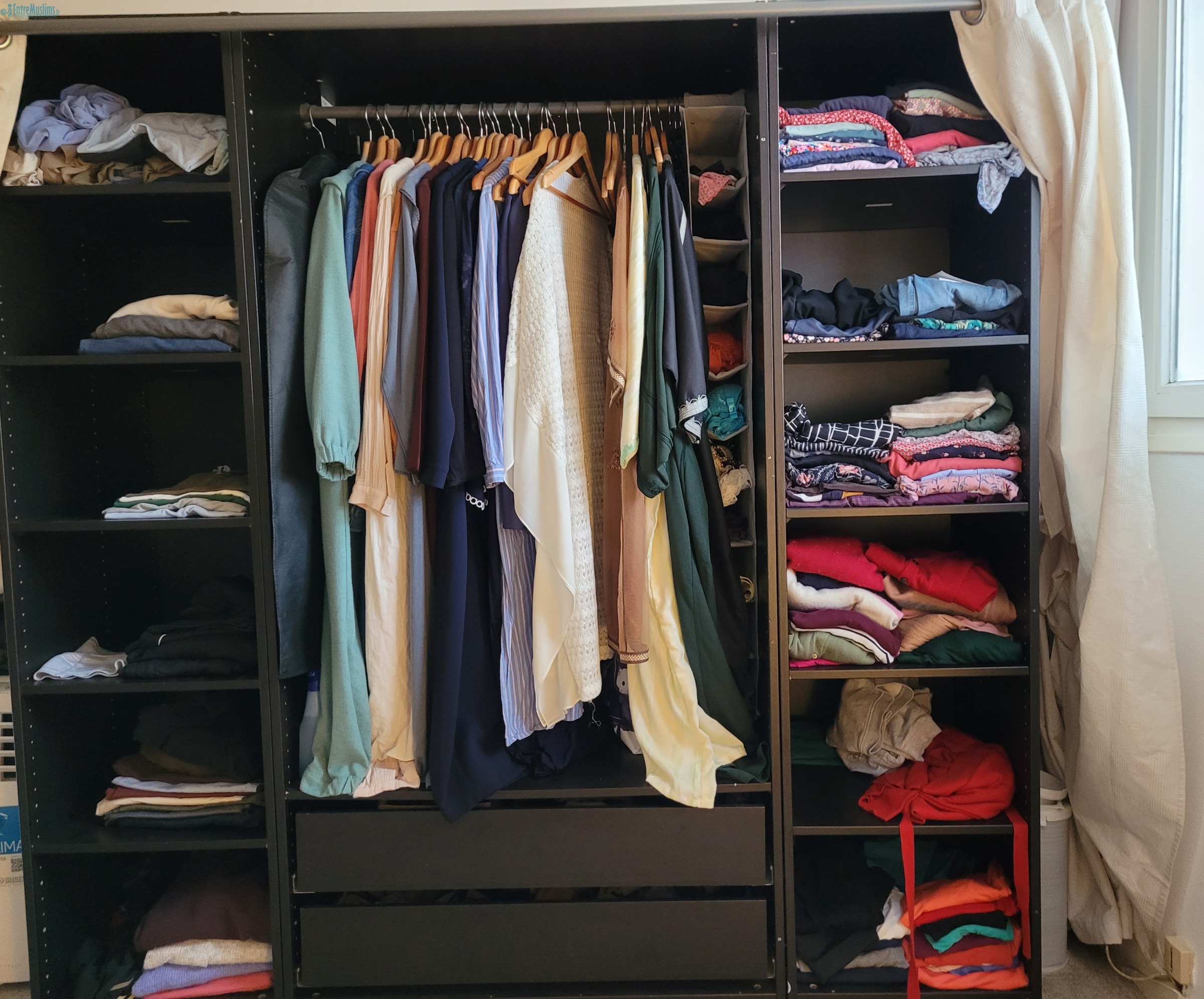 2 colonnes avec étagères. 1 large colonne pour les cintres. 2 grands tiroirs
