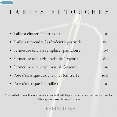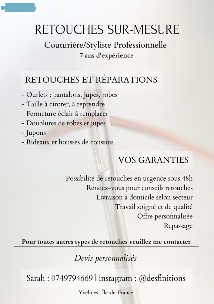 Je propose mes services en tant que couturière professionnelle, j'effectue toutes sortes de retouches vêtements : ourlets, fermetures éclairs, doublures et jupons, retouches d'ameublements, retouches sur robes de soirées ou de mariées etc. Je me déplace dans les départements du 78, 75, 93, 92, 91, 94 et 95.