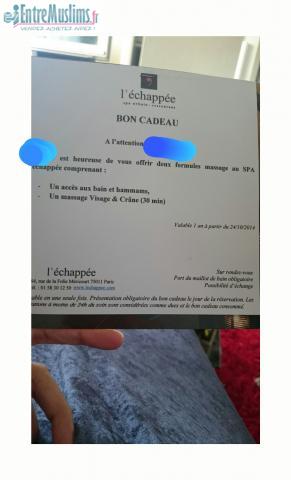 Salam. Je vend un bon cadeau pour 2 personnes dans un spa à paris. Comprend un accès au bain et hamam et un massage visage (30min).comme Ya le nom de la personne possibilité de changée de nom (j'ai appelé le spa mon di oui je peux changer) pour plus d'informations laissé moi un mail.