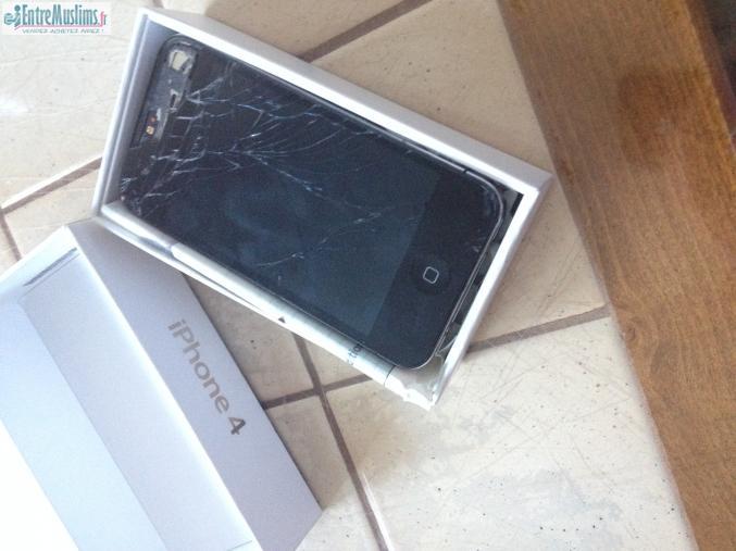 Salam aleykoum, je vend mon iPhone 4 - 8gb dans sa boîte, avec facture sans chargeur. La coque arrière se détache du téléphone, mais vu que c'est à changer ce n'est pas grave, l'écran aussi est cassé, il y a pour 20€ de réparation d'où le bas prix. Le téléphone fonctionne parfaitement, batterie neuve et débloqué pour tout opérateur.