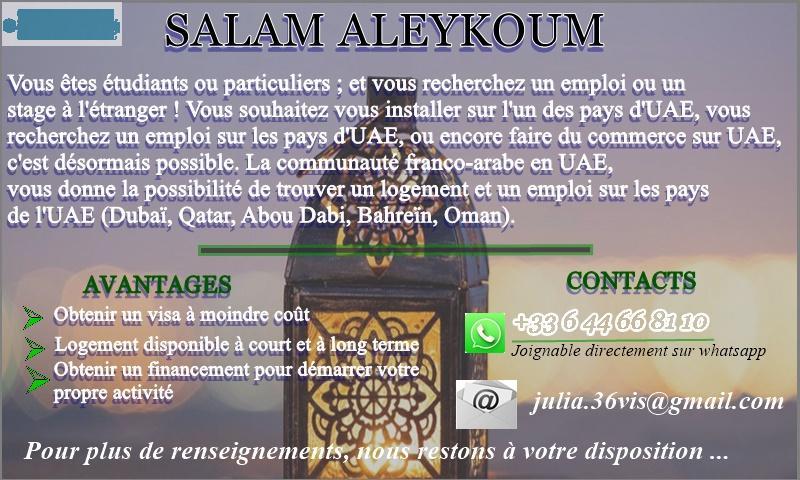 L'association française de Dubaï, vous offre la possibilité d'emménager sur les pays de l'UAE . Des emplois et des logements vous y attendent incha Allah. Pour plus de renseignements, prière de nous contacter par mail.