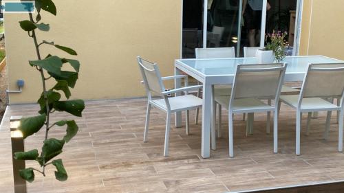 Rez de chaussée un hall donnant sur un espace de vie climatisé de 40m2 avec grande télé smart ( Netflix, YouTube…etc.) et une cuisine ouverte tout équipée avec son bar et sa table pour des repas conviviaux