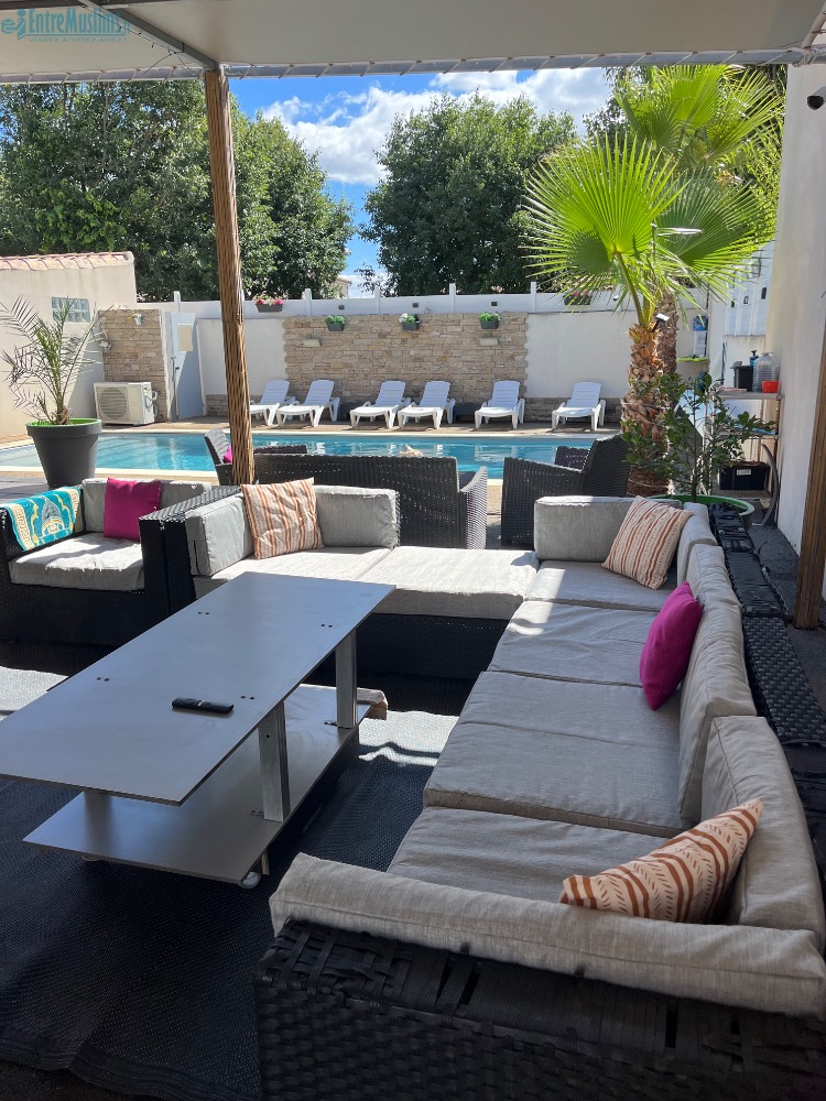 Avec une tonelle et grand salon de jardin et un barbecue .
