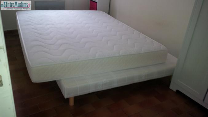 Matelas mousse polyuréthane bloc de 17 cm, densité 24 kg/m3, 21 cm d'épaisseur, 2 plateaux piqués sur ouate, plate bande piquée, coutil poly-coton ; Sommier tapissier 10 lattes fixes, 12 cm de hauteur