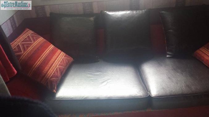 Salam 3alaykoum je vends un canapé 3/4 places assez large. En simili cuir noir et tissu rouge avec 5 coussins. Longueur 2,37m. Le canapé est très légèrement fendu sur une assisse (voir photo) et l'un des coussins est un peu ouvert (voir photo) Le canapé reste malgré tout en très bon état. Le canapé est à retirer sur place, venir à deux voir trois personnes car on ne pourra pas vous aider.