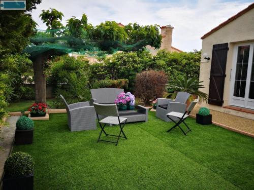Une chambre suite, avec salle de bain +mobilier, baignoire, lavabo, toilettes, sèche-cheveux, 2 lits superposés +1 lit double séparé, placard, ventilateur, TV LED haute définition ,chaines TNT HD. La chambre donne sur une agréable Terrasse 4 x2 m avec gazon artificiel, table, chaises+ parasol