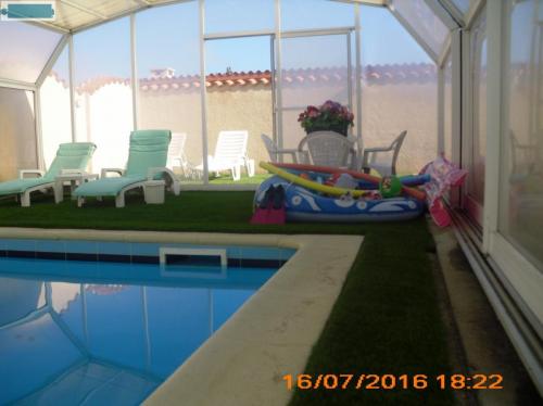 Piscine 10 x 4 m à profondeur variable (1,25 à 2 m) + escalier ; Chauffée par une pompe à chaleur du 15 mai au 15 septembre non-stop, avec abri haut de 2,5 m. Prés de la piscine et dans un locale un 3eme wc avec lave-main intégré. Baignade en toute intimité garantie jour et nuit. Sous l'abri, vous pouvez aisément circuler et les enfants peuvent jouer sous la surveillance des parents, dans une zone de détente avec gazon artificiel de 25 m2 . Autour de la piscine, du Gazon artificiel ainsi que sur la zone réservée au bain de soleil dehors, derrière la piscine, 100% sans vis-à-vis, 2 chaises longues + une petite et une haute table, 4 chaises à l'intérieur de l'abri.2 transats en plus à l'extérieur .