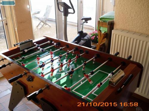 Belle véranda, table, 6 chaises, desserte, Baby-foot, Mini stepper, vélo d’appartement, 2 grandes baies vitrées avec volets roulants électriques à télécommande. La véranda donne sur la terrasse,