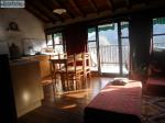 Salle de séjour avec coin cuisine ayant une grande baie vitrée donnant sur le balcon avec vue sur le Canigou.