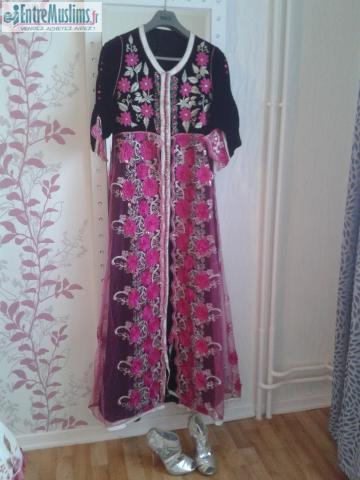 salam alaykoum je vend ce magnifique caftan haute couture , tissu velours de soie noir, strass Swarovski avec les 2 ceintures une à nouer et une à lacet + escarpins pointure 38.
