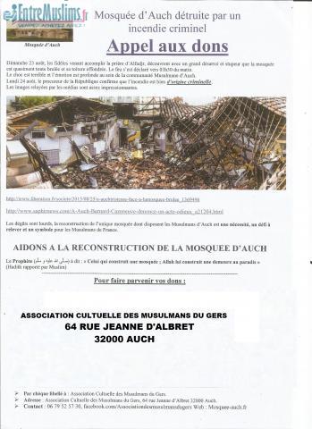 Salam alikoum, je m'appelle Nordine, aujourd'hui jour de prière du vendredi, un membre de la mosquée de Auch est venu nous demander de l'aider financière pour la reconstruction de la mosquée qui vous savez a été victime d'un incendie criminel. Je vous invite à envoyer vos dons par chèque, et si vous souhaitez faire un virement, venez en privé me voir sous le pseudo facebook (Nordine Benstar) afin de vous communiquer les coordonnées bancaire et le numéro de téléphone du responsable. Nous comptons sur votre générosité. Je compte sur le soutien de l'administrateur afin de poser cette annonce