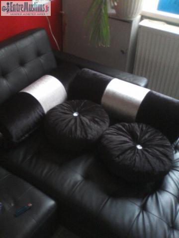 Salam aleykum,il y'a 2 boudin noir et gris argenté et 2 coussin rond noir avec "diamant" au milieu en excellent état car acheté il y a peu a Bruxelles pour 100e,je les laisse pour 45e.contact uniquement par tel ou sms.idéal pour canapé style baroque ou sedarie. Salam