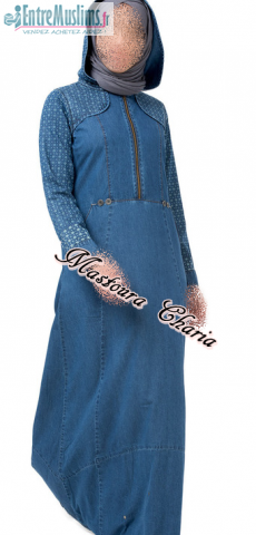 Abaya en jean à capuche de haute qualité avec fermeture à glissière ( peut convenir aux femmes qui allaitent ) . Manches et capuches a motifs pour un effet stylé , avec un bel évasement . Finitions impeccables .