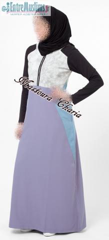 Abaya Sportwear de haute qualité , Imprimé Abstrait sur la poitrine . Fermeture éclair sur le devant . Manches noir en coton . Bi color gris et bleu sur le bas . Finitions impeccables .