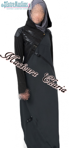Abaya chic noir de haute qualité a capuche avec détails à bande brillante , épaulettes similicuir et une sangle à boucle sur le devant. Finitions impeccables