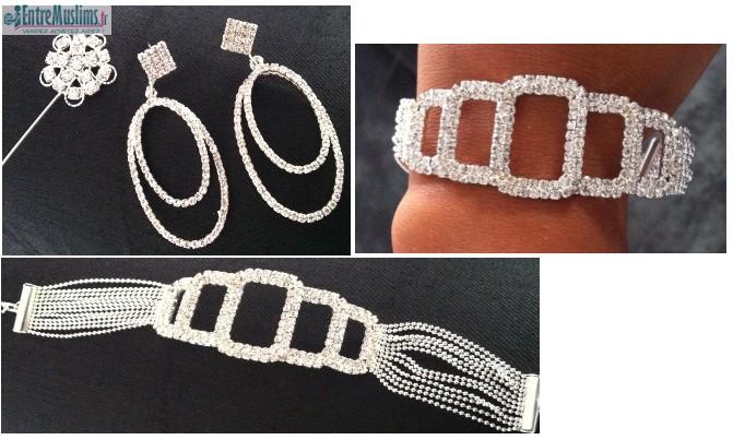 Je vends cette parure couleur argent avec strass, je l'avais acheté pour une occasion mais je ne l'ai finalement pas porté. Il y a le bracelet, la paire de boucle d'oreille, ainsi qu'une épingle strassé pour fixer le hijeb.