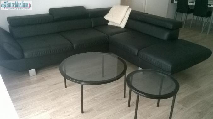 Vends lot de meubles: Grand canapé d'angle, bibliothèque, deux tables basse, table de salle à manger avec 4 chaises.