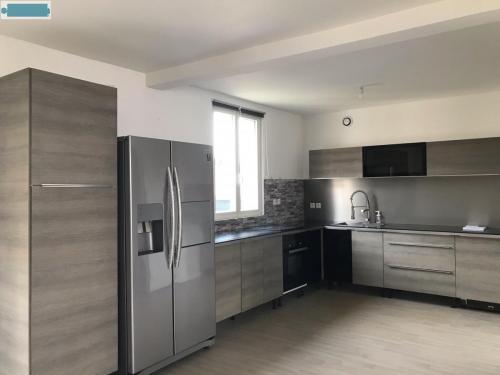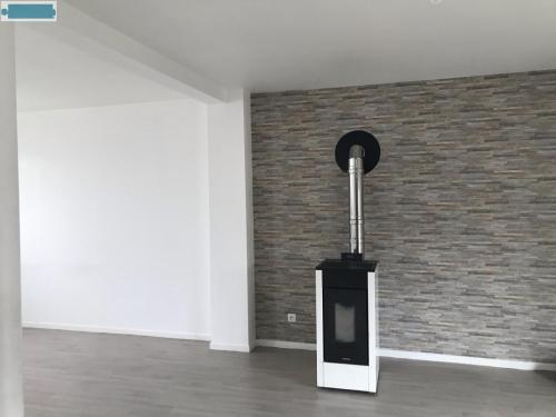 - 2 garages, un hall d'entrée, une salle à manger avec un poêle à granules, une cuisine ouverte, une salle de bain