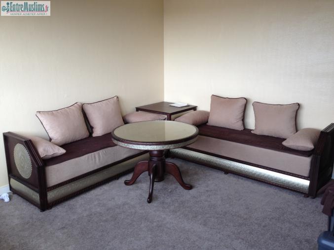 Comprenant : deux bancs 70*208, un coffre-coin, une table ronde, matelas par dessus et coussins compris)