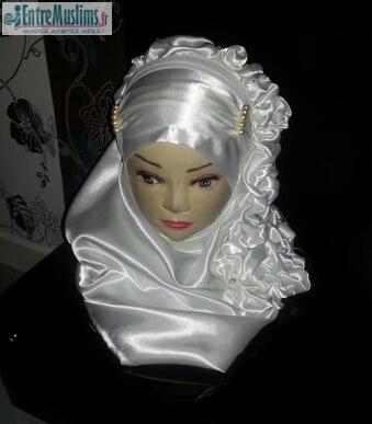 Je vend un hijab de mariage blanc jamais porter va sur toute tete consu expret matiere soie